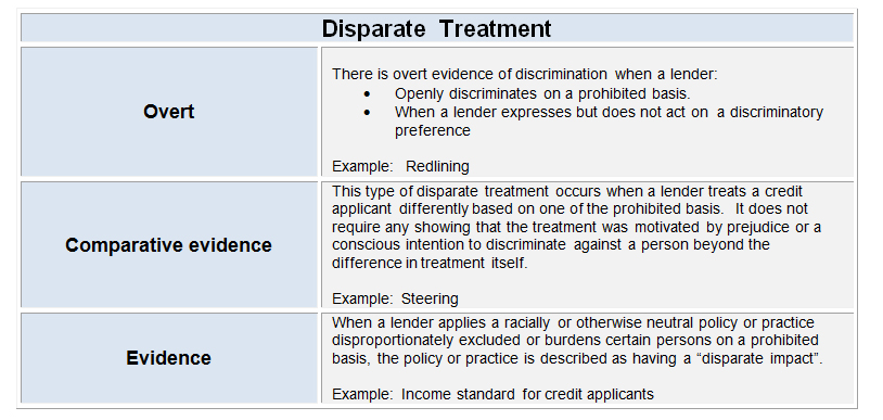 Comparative evidence - This type of disparate treatment occurs when a lender treats a credit applicant differently based on one of the prohibited basis. It does not require any showing that the treatment was a motivated by predjudice or a conscious intention to discriminate against a person beyond the difference in treatment itself. Example: Steering